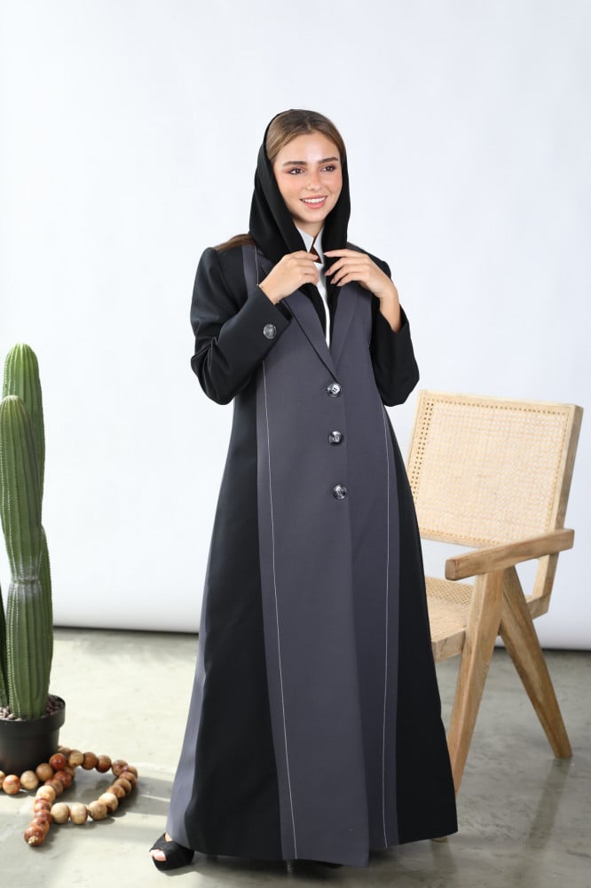 عباية بليزر راقية ومتميزة وعملية مصنوعة من أجود انواع الكريب الفيتنامي تم فيها دمج اللون الأسود مع اللون الرصاصي بتجانس غني ورائع يميز القطعة ويمنحها لمسة من الابداع والفخامة وبقصة Aline تسمح لك بالحركة أثناء العمل بحرية تامة