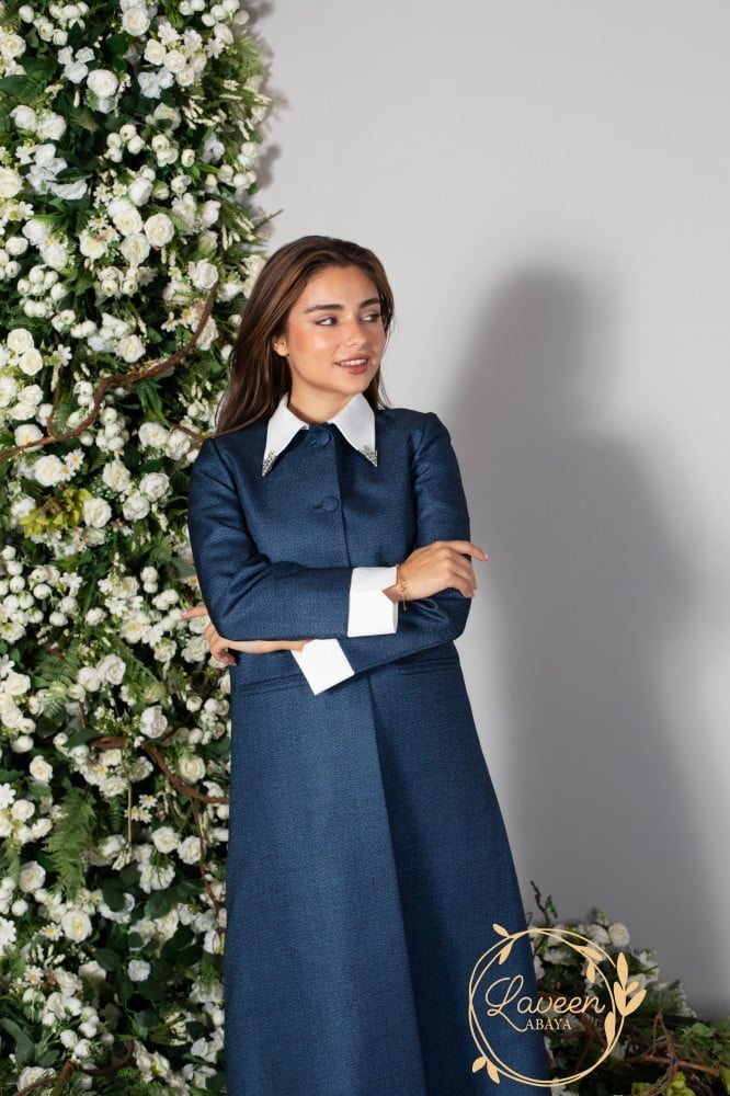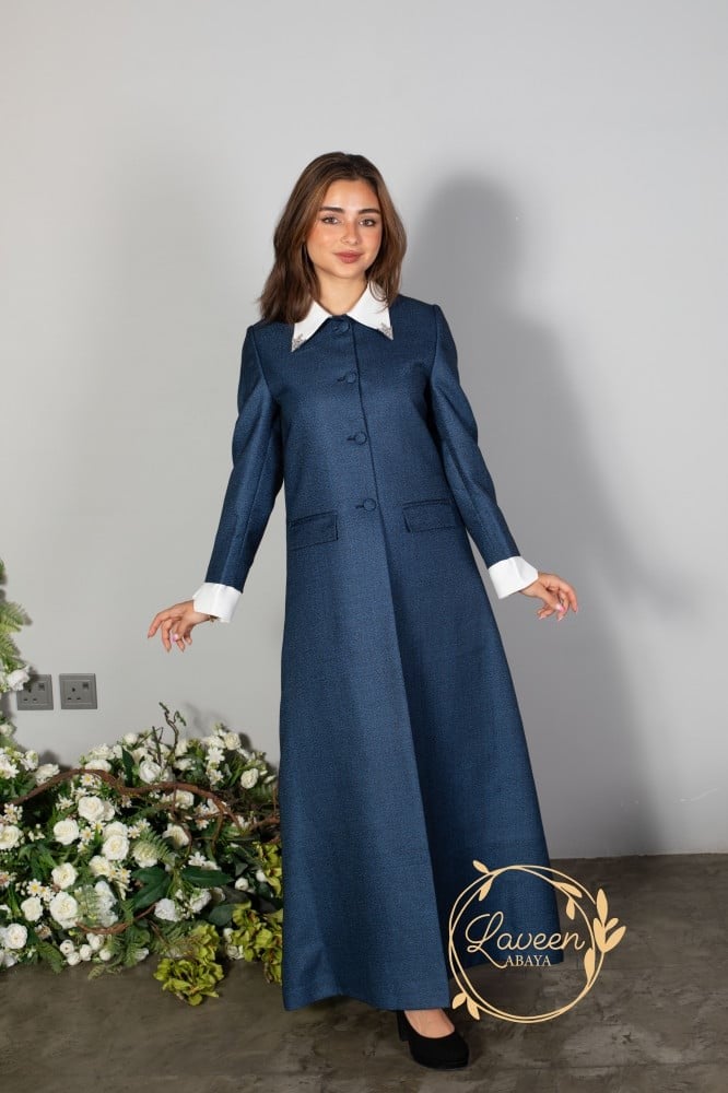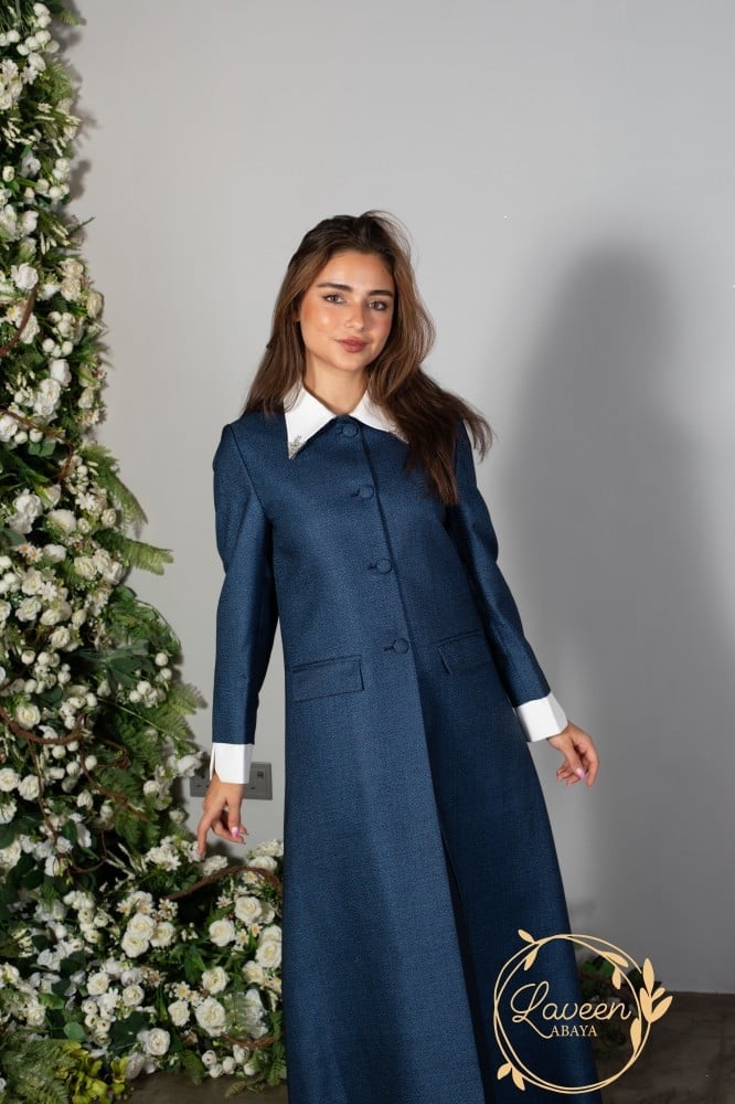 عباية كاجوال شتوية/صيفية أنيقة ومميزة باللون الأزرق بقماش شتوي/صيفي فخم وأنيق مع تداخلات باللون الأبيض في الياقة والأكمام ومزينة باكسسوار أنيق ومميز باللون الفضي على طرف الياقة قابل للإزالة والتركيب مما يجعل من هذه العباية قطعة فريدة ومميزة تناسب ذوقك وتزيد من أناقتك