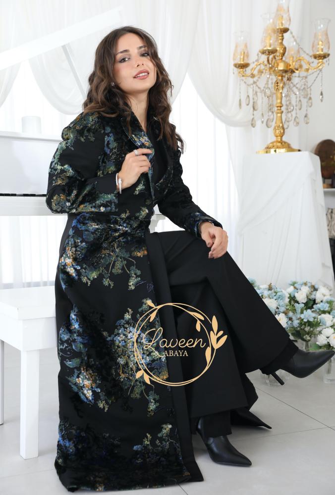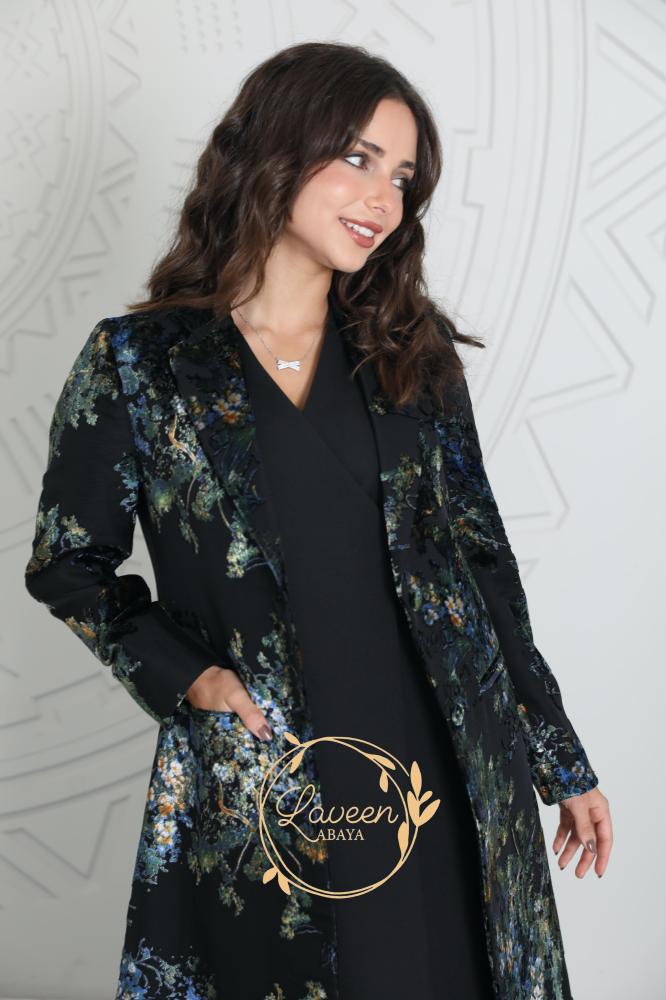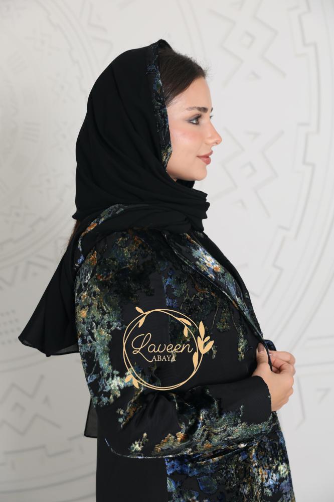 عباية بليزر شتوية باللون الأسود الملكي مزينة من الأمام بقماش شيفون مشجر بالمخمل بنقوش راقية وأنيقة باللون الأزرق والأخضر مستوحاة من الطبيعة لتمنحك حضور ناعم وراقي في كل خطوة.