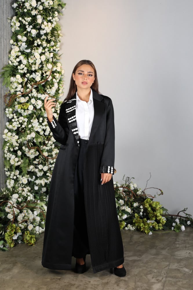قطعة صيفية فخمة ومتميزة من قماش الكريب الفيتنامي مزينة بدانتيل جلد باللون الأسود والأبيض على الياقة وطرف الطرحة .ومضاف للعباية قطعة كروسيه فخمة تتناغم بشدة مع موديل العباية الأنيق والمميز يمكنك طلب هذه العباية مع بدلة داخلية LA40 مكونة من قميص أبيض وبنطلون أسود من نفس قماش العباية
