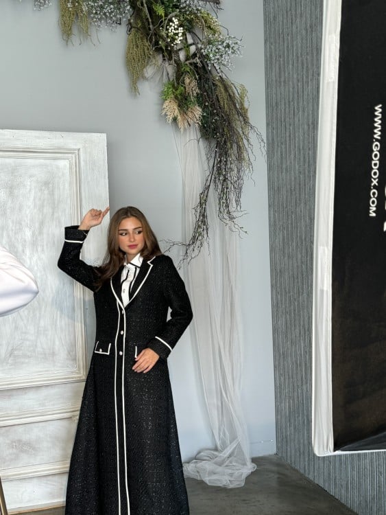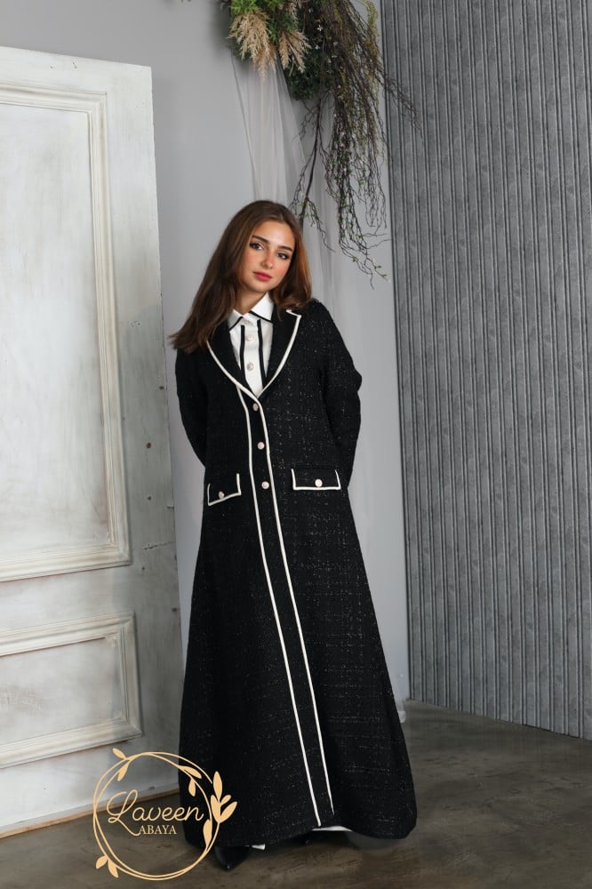 قطعة رومانتك راقية ورفيعة المستوى تستحق الاقتناء لمحبي التميز والفخامة . صممناها لكم بخامة شتوية فاخرة من قماش التويد شانيل الأسود الفاخر والمزين بقيطان أبيض وزراير معدنية باللون الأبيض مع الذهبي