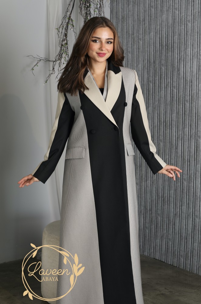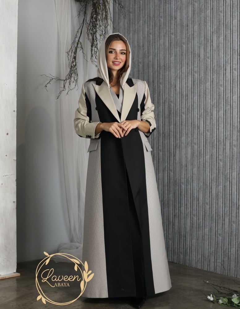 عباية شتوية رسمية وأنيقة باللون البيج و بقماش مربعات صغيرة أنيق ومميز على جوانب العباية والأكمام والخلف وتداخلات باللون الأسود أضافت للقطعة لمسة إبداعية أنيقة ومميزة