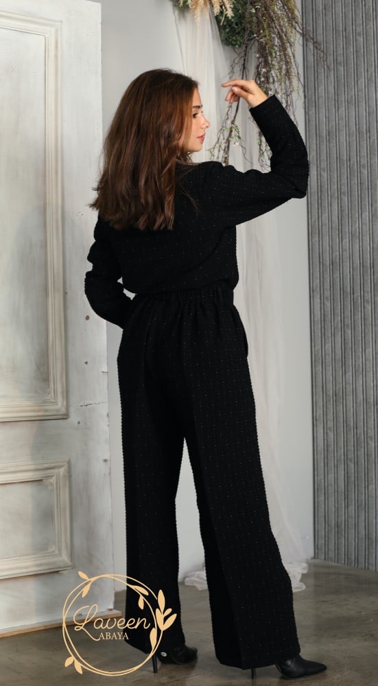 جميع المنتجاتبدلة أنيقة وعملية بكم طويل وبقماش كريب كوري شديد السواد منقط باللون البيج ناعم ومريح وعملي