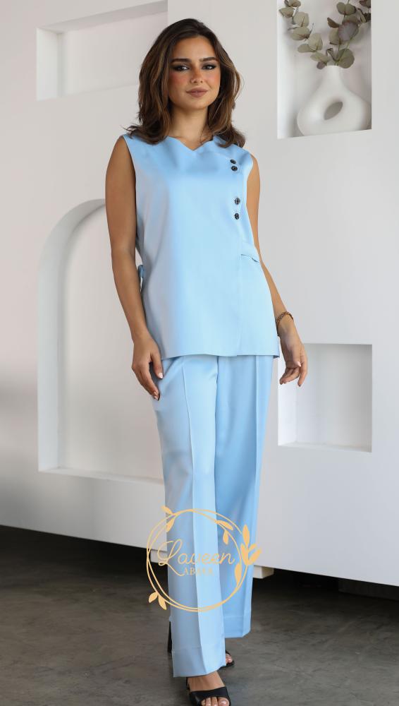 بدلة داخلية صيفية و رسمية ومميزة عبارة عن بلوزة مبطنة وبنطلون رسمي بقصة مستقيمة عالية الخصر وبقماش كريب اندونيسي عالي الجودة