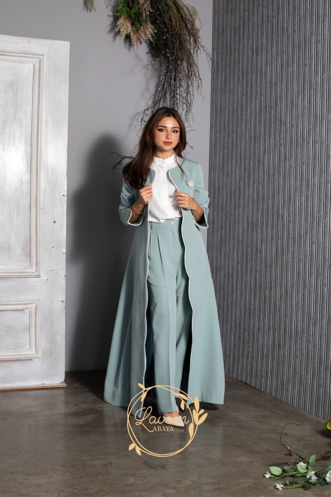 An elegant official blazer with a distinctive and sophisticated cut in the quiet and beautiful tiffany color and a white accent on the edges of the abaya and decorated with an elegant removable pearl brooch with a French crepe fabric suitable for the summer, making it a high-end and elegant piece worth acquiring