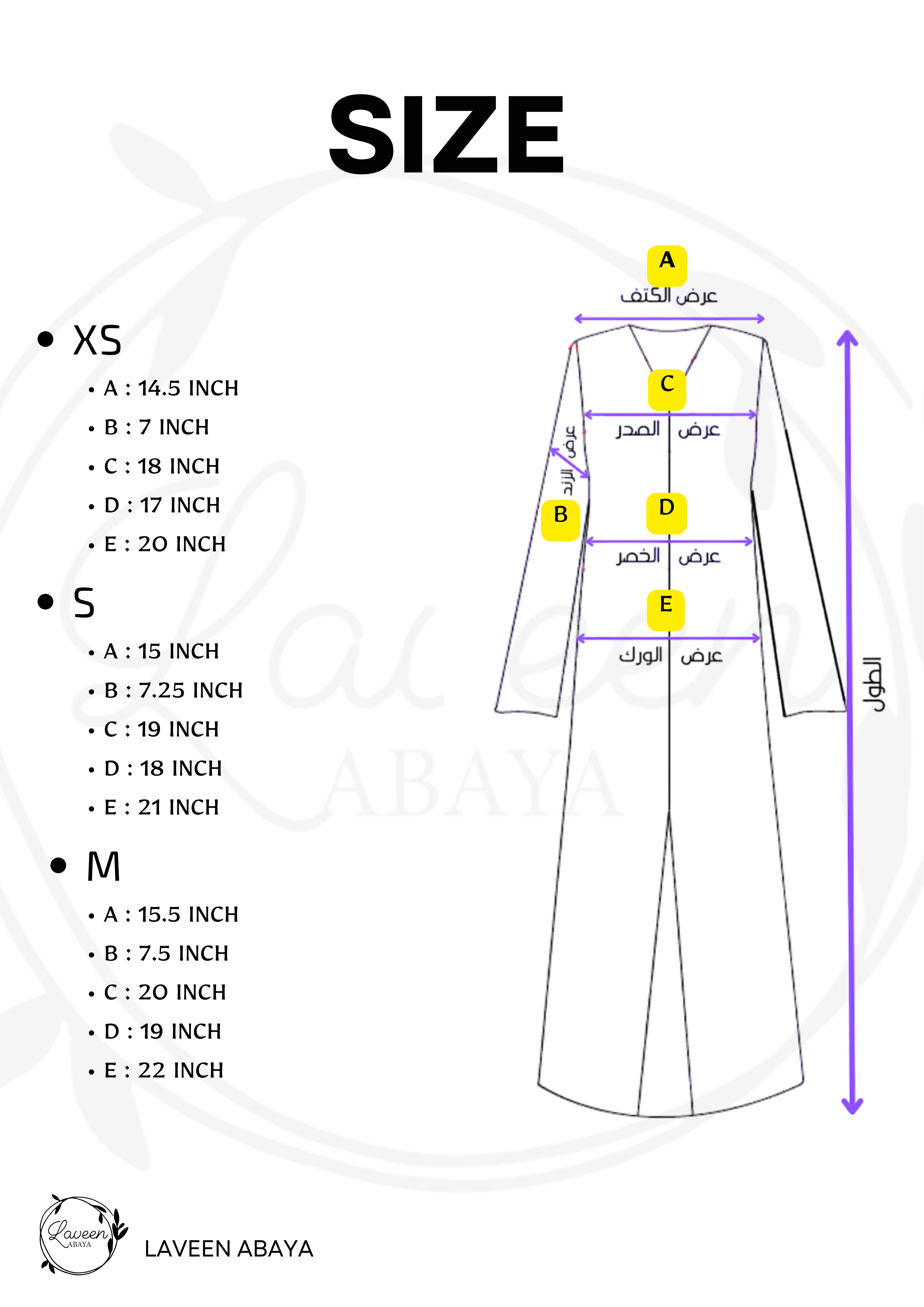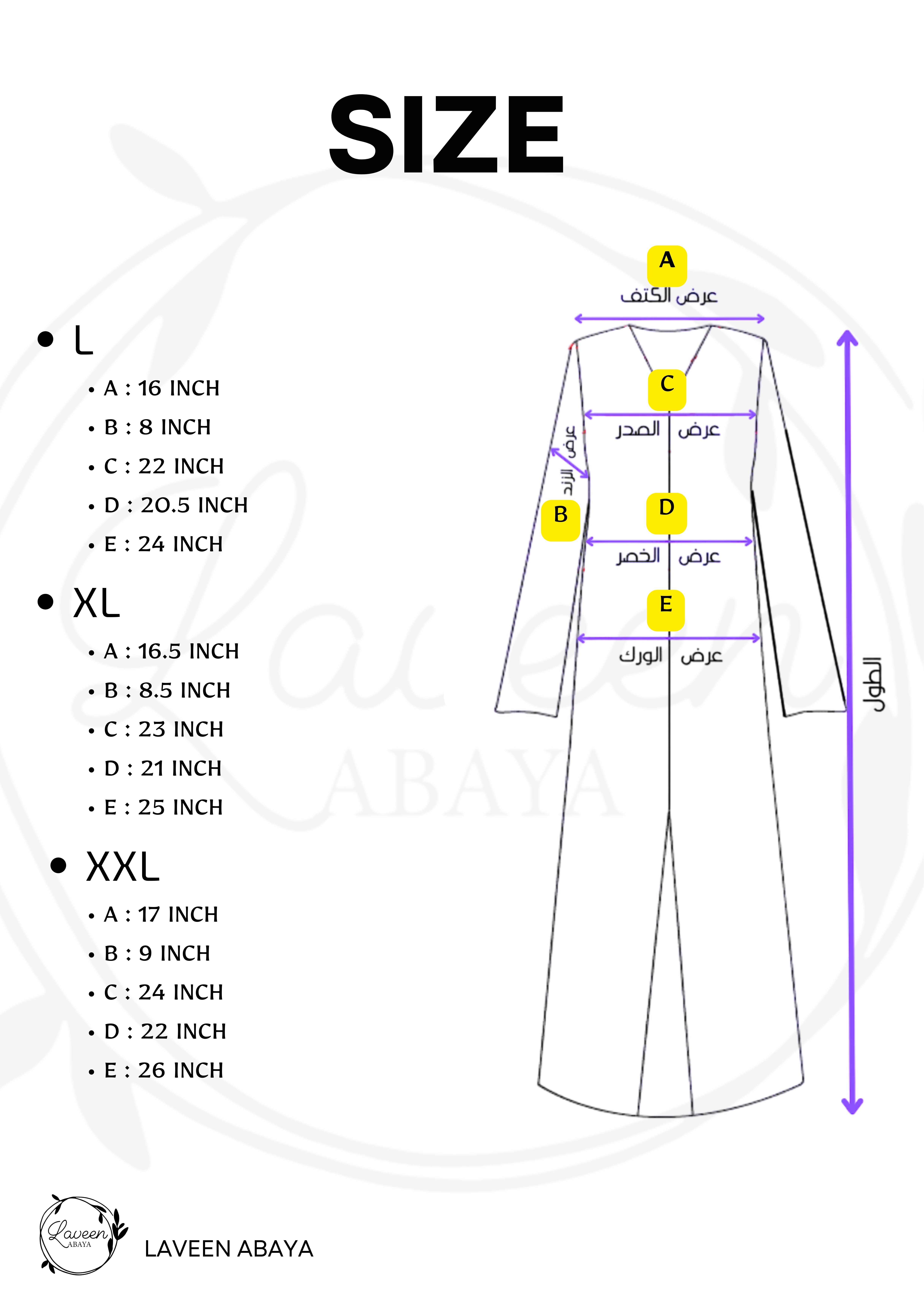 The abaya will be received in the following sizes :